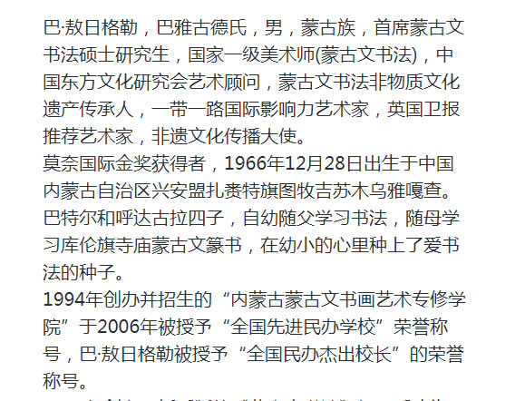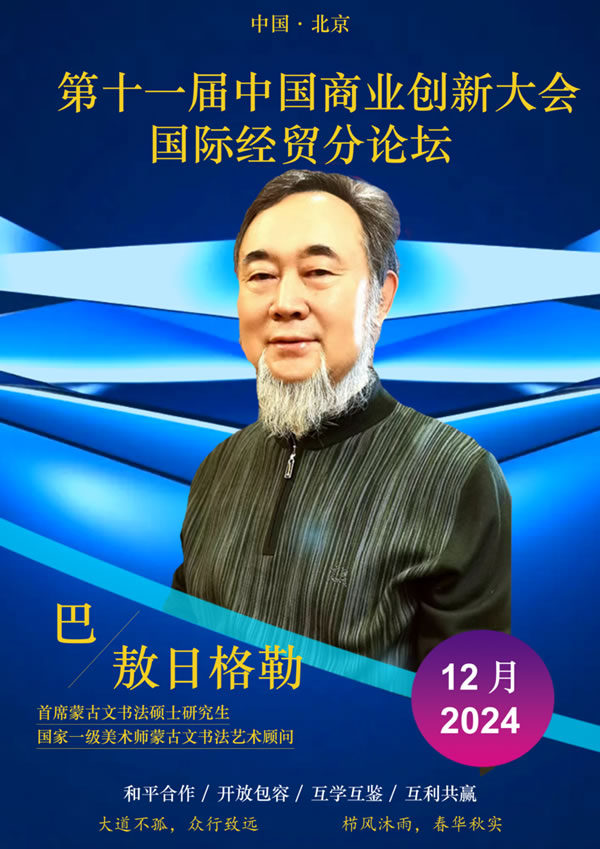 2024年1月11日,在蒙古国乌兰巴托市隆重举行了《蒙古文人墨客--2023》27届国际书法大赛开幕式,蒙古国总统敖· 呼日勒苏赫先生,中华人民共和国驻蒙古国特命全权大使沈敏娟女士亲临会场并祝贺,为这次大赛增添了光彩,具有深刻意义。蒙古国总统敖· 呼日勒苏赫与内蒙古自治区蒙古文书法家协会主席巴·敖日格勒带领团合影留念。他的作品2024年8月作品获得莫奈国际金奖,2024年《心善乃长寿之本》在英国罗素成功拍出,2024年第2期《中华遗产》刊物上发表《班禅额尔德尼玉玺的蒙古文篆体字解说》一论文,2024年第5期《文学研究文摘》刊物上发表《乌苏图召两件宝贝》。